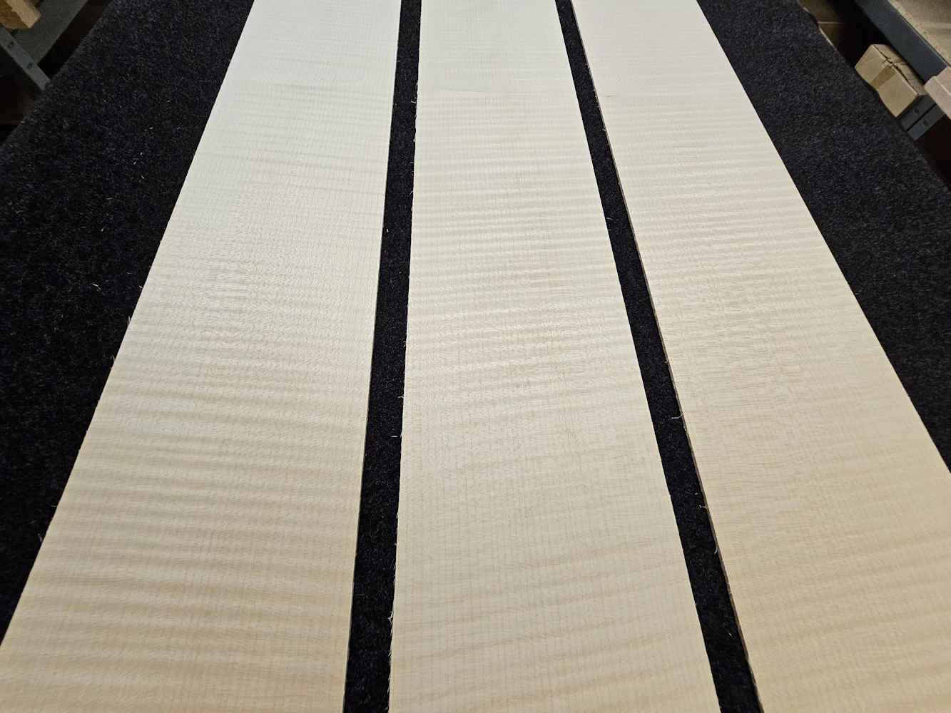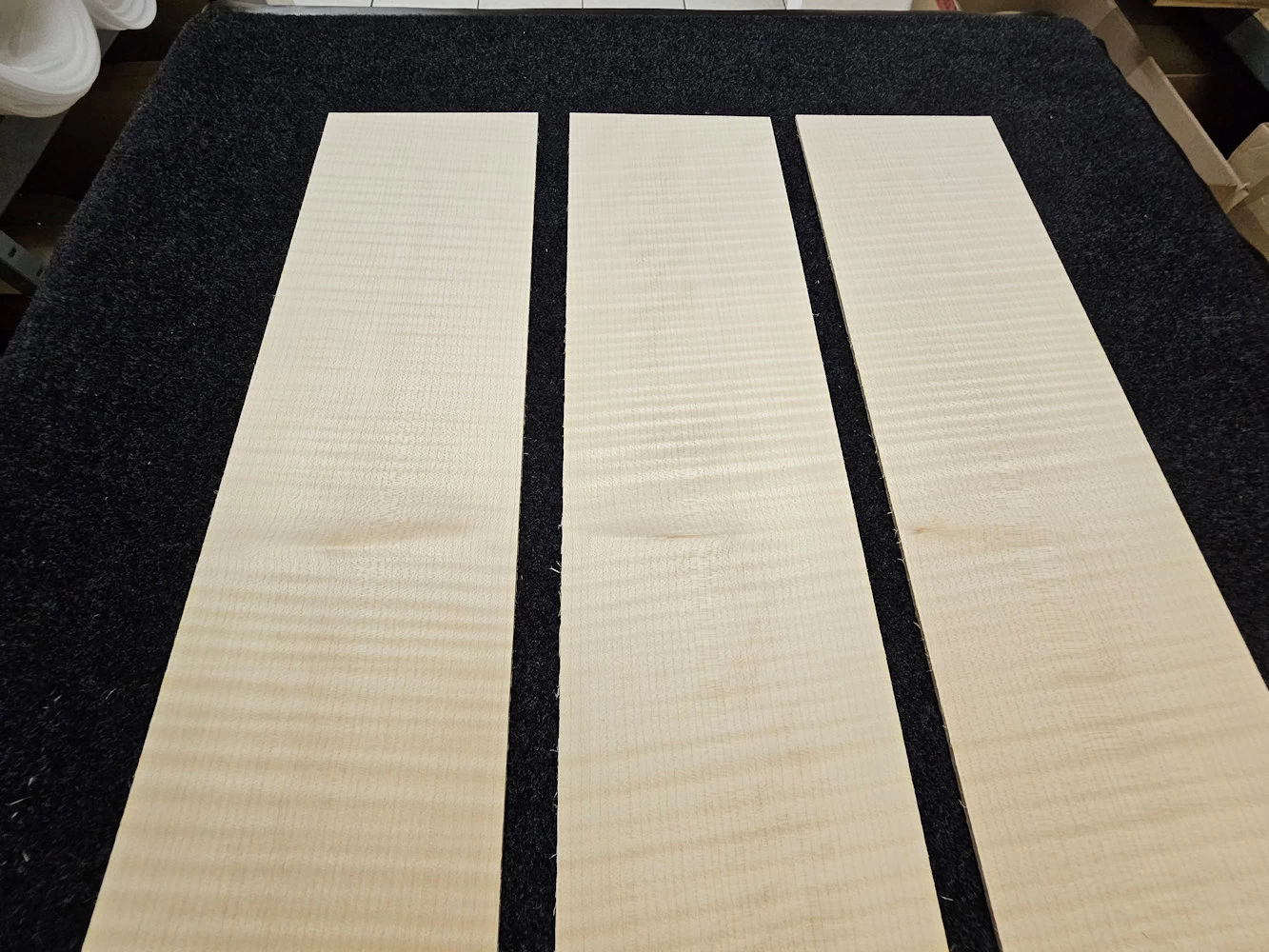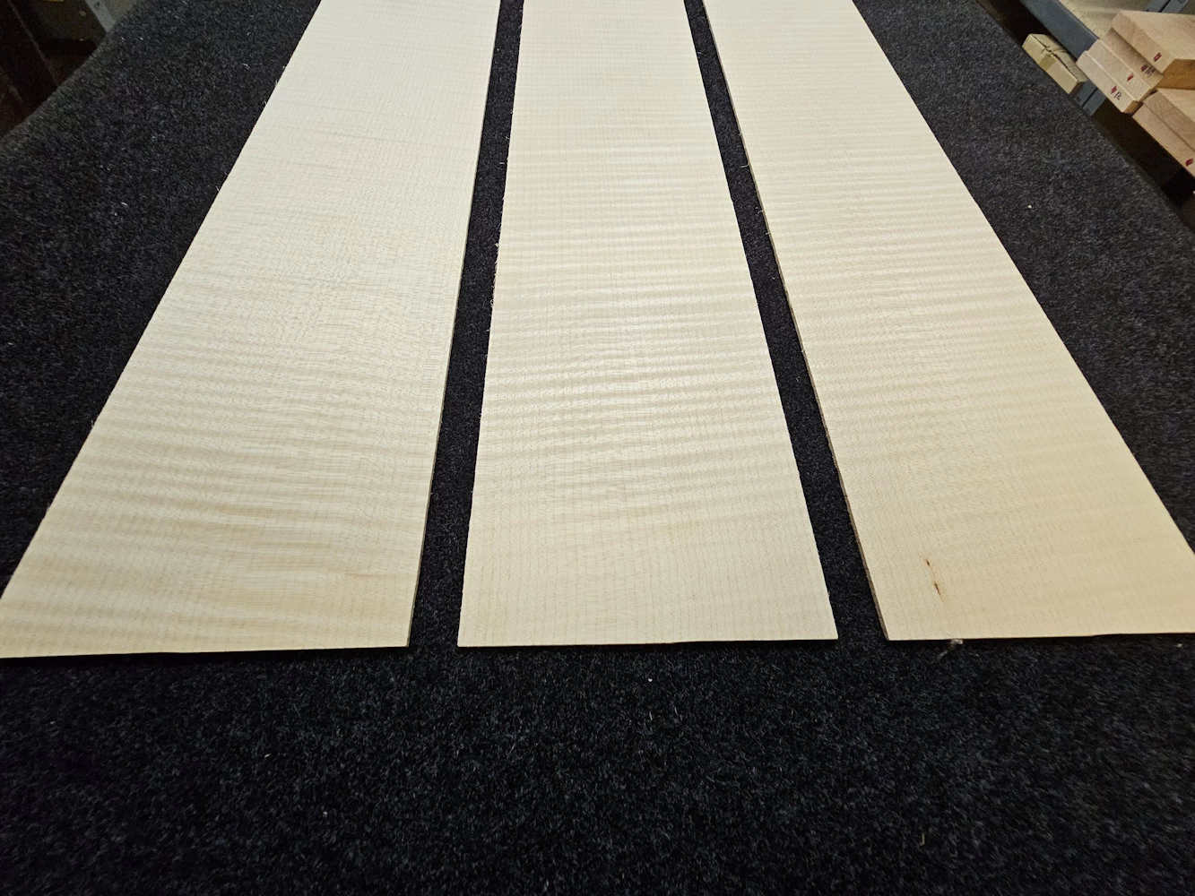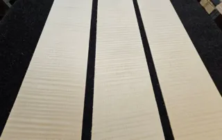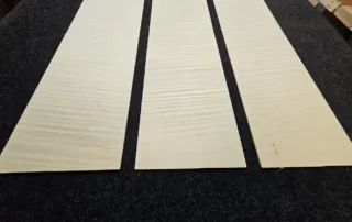 3 schöne Riegelahorn Gitarren Seiten. Drei Stck. ist nicht gerade eine passende Anzahl für Gitarrenseiten. Es liegt jedoch daran, das sie alle bookmatched, -von einem Block geschnitten wurden. Und dieser war eben nicht dicker. Das sollte jedoch nicht soviel ausmachen, weil die anderen hier gezeigten Seiten sehr ähnlich,- und daher kompartibel sind.